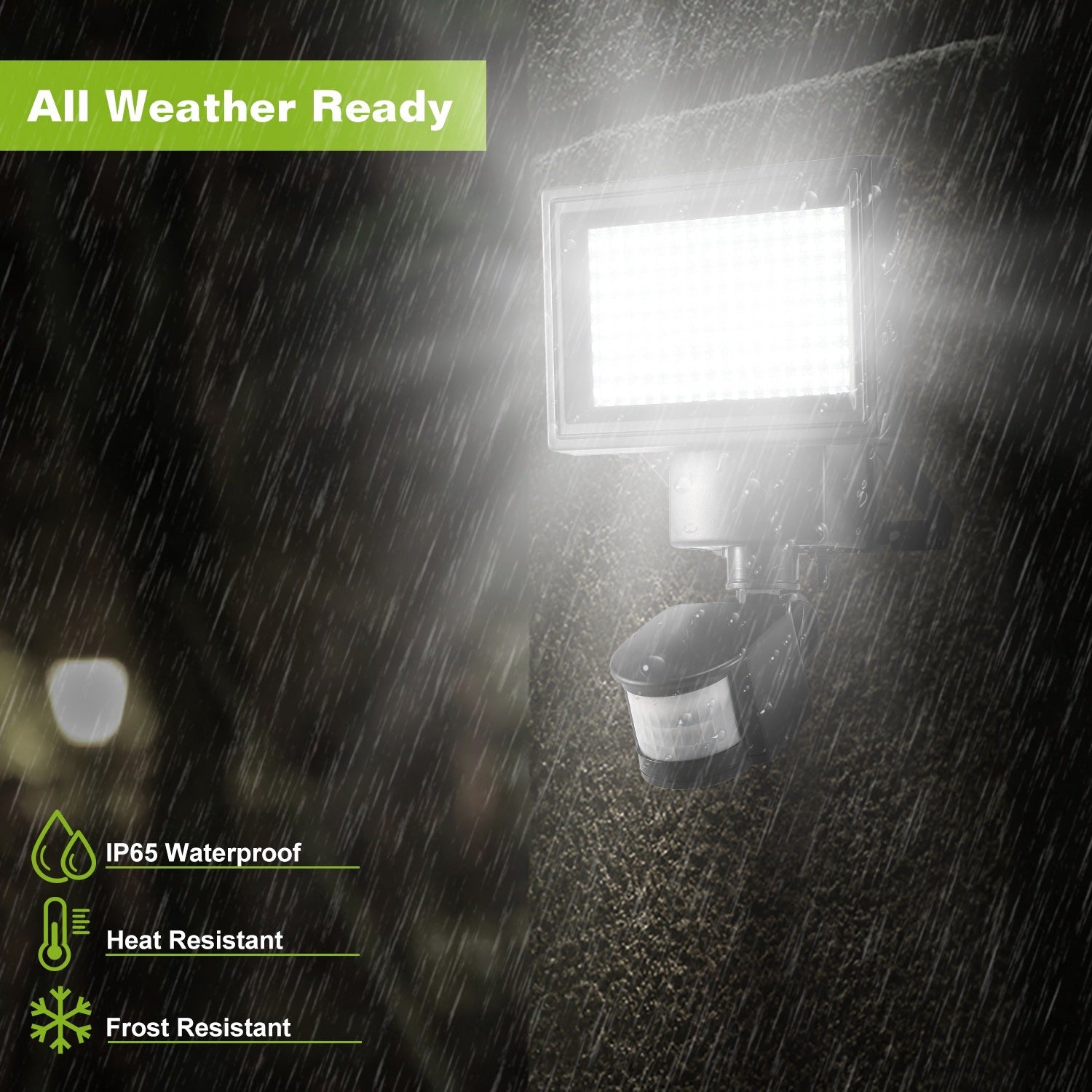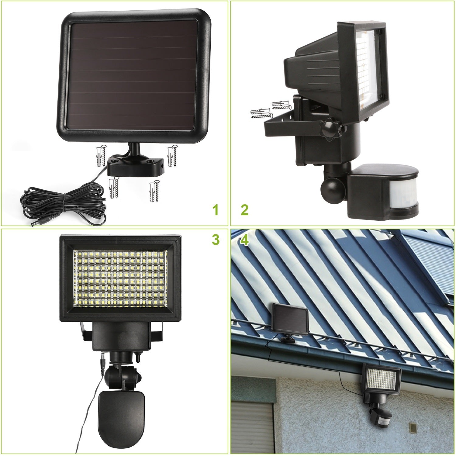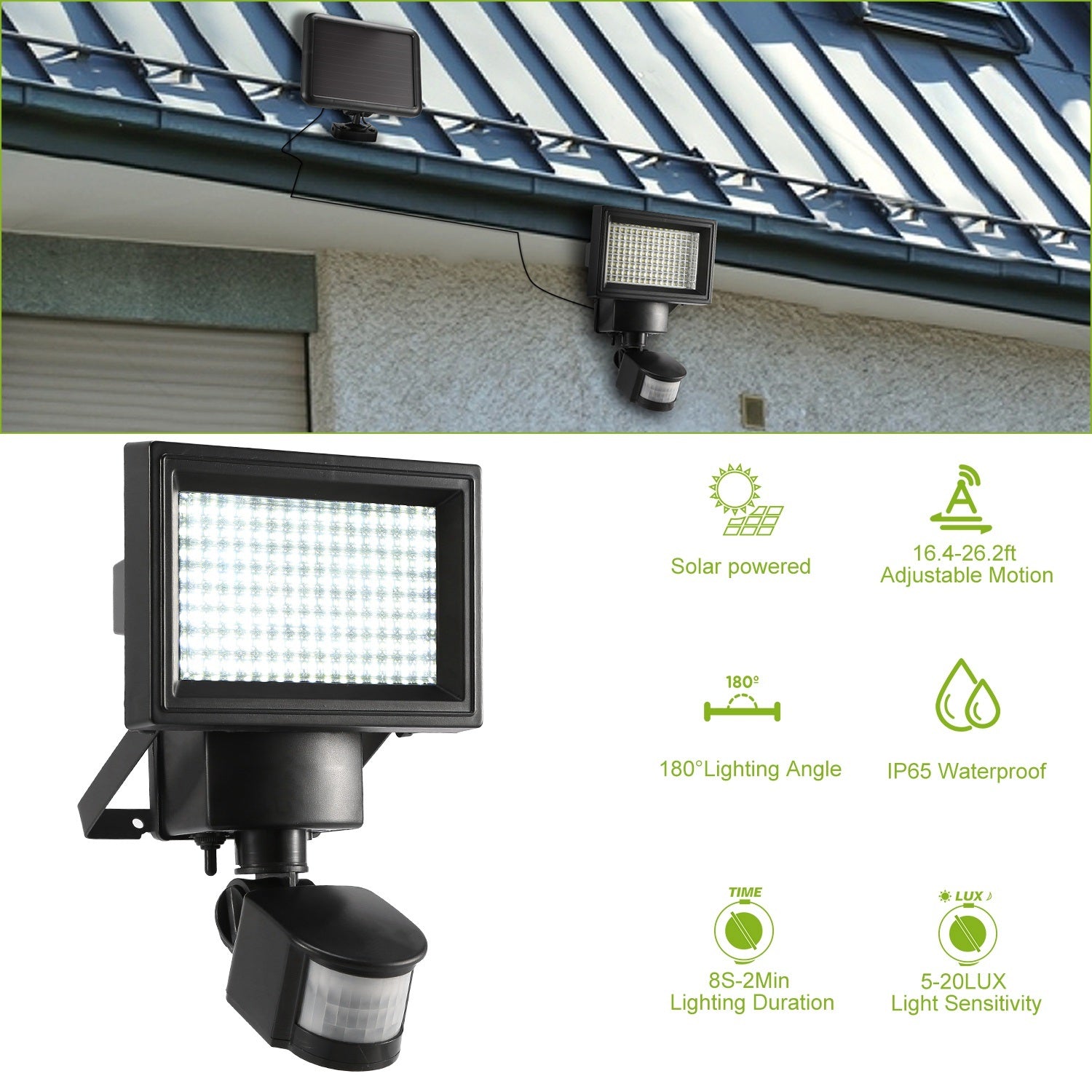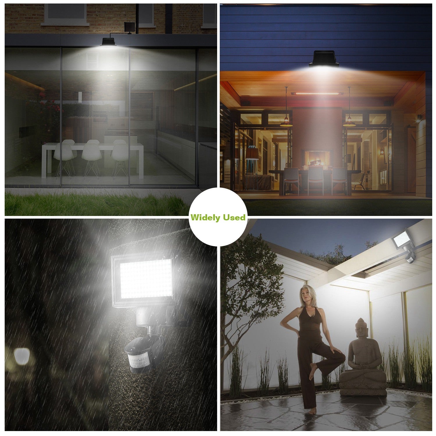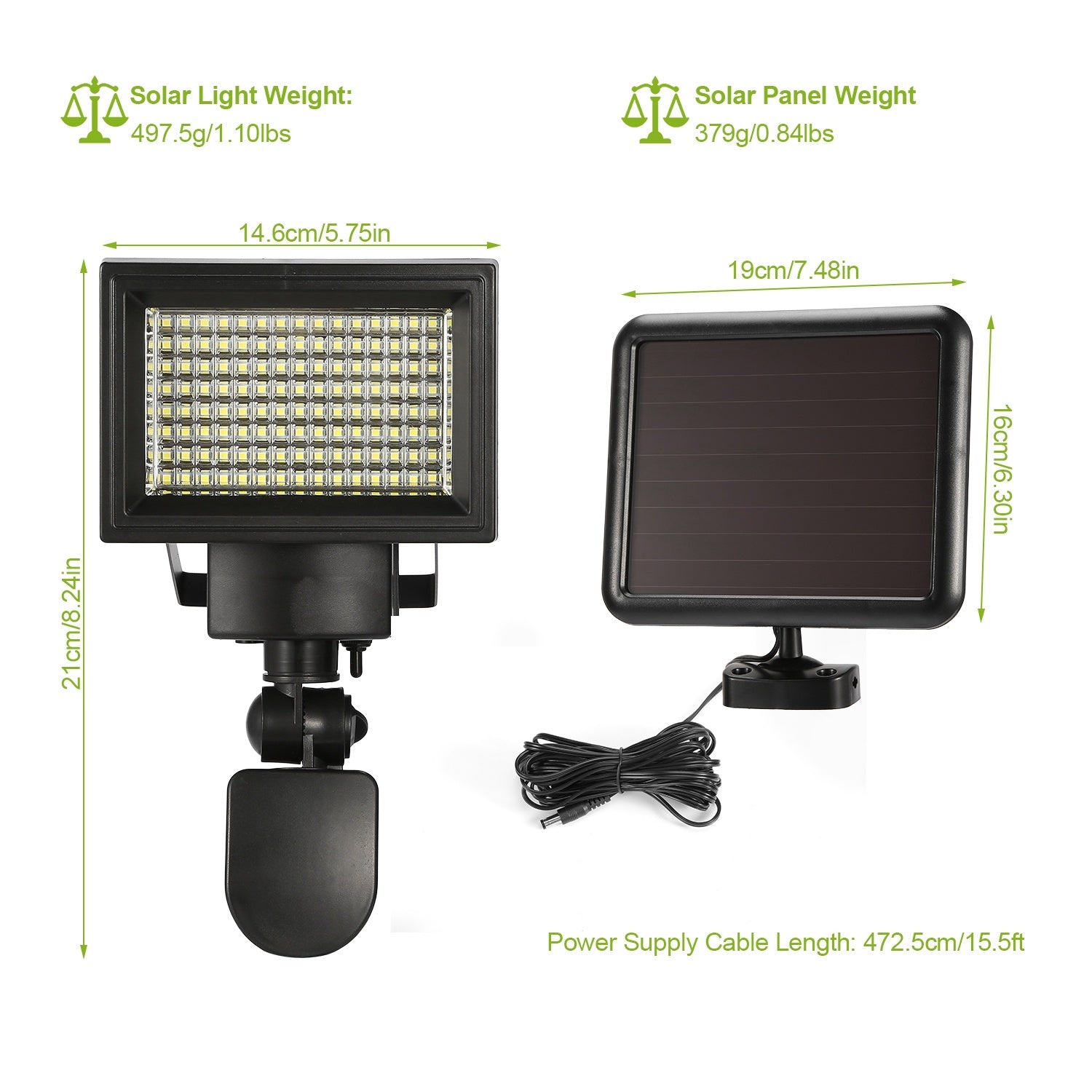 **120 LEDs Ultra-Bright Solar Powered Lights*:Inbuilt bright 120 SMD2835 LEDs with 900lm maximum output and sensitive motion sensor with 120° wide sensing angle which provide up to 180° illumination range and turn the dark space into a bright lighted space for security and safety protection.