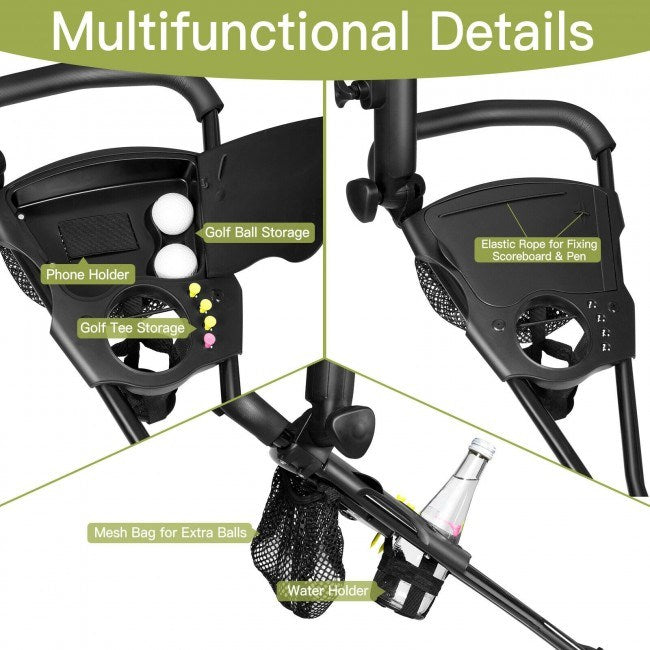 Brand new and high qualityLightweight; durable contructionErgonomically shaped handle for both right and left handed golfersScorecard holder; Mesh Bag; Beverage Holder Easy Clip Bag StrapsFoldable design with 3 removable wheels to save storage roomAll terrain 10" inch rear wheels for smooth gliding and foot brakeSimple Assembly Is Required According To Included Instruction