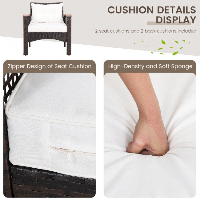 Comfortable Single Sofas: This 3-piece rattan set includes 2 ultra-comfortable single sofas. The curved acacia wood armrests and cozy backrest will make you feel relaxed without fatigue. Every sofa comes with a seat cushion and back cushion which are filled with high-density and a soft sponge.