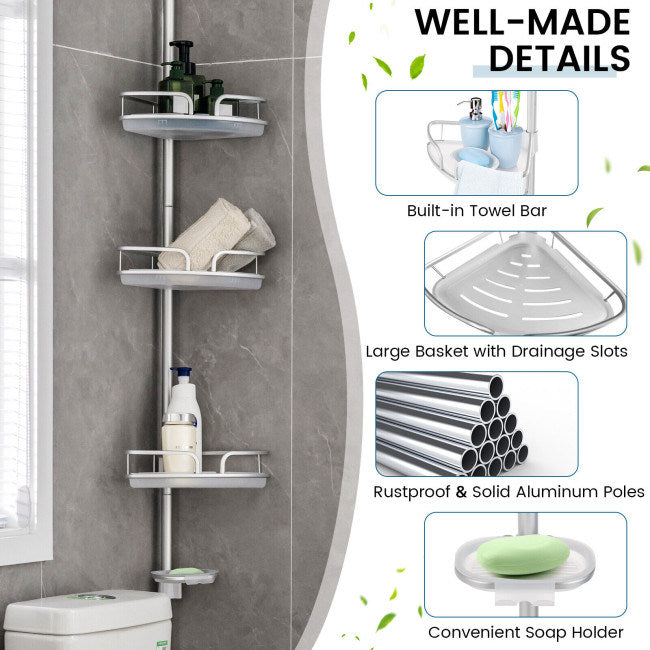 Equipped with 3 baskets and a soap tray; this shower caddy offers ample storage space. The baskets and tray are free to adjust positions to meet your different needs. Also; there are anti-falling guardrails and drainage holes for extra safety and quick drainage. Designed with an extension pole; the shower shelf is adjustable to fit most shower rooms and bathtubs and the installation is quick and easy without drilling or tools. Made of durable and rustproof aluminum material; this pole organizer is able to withstand wet environment; suitable for various places including shower room; bathtub and kitchen.
