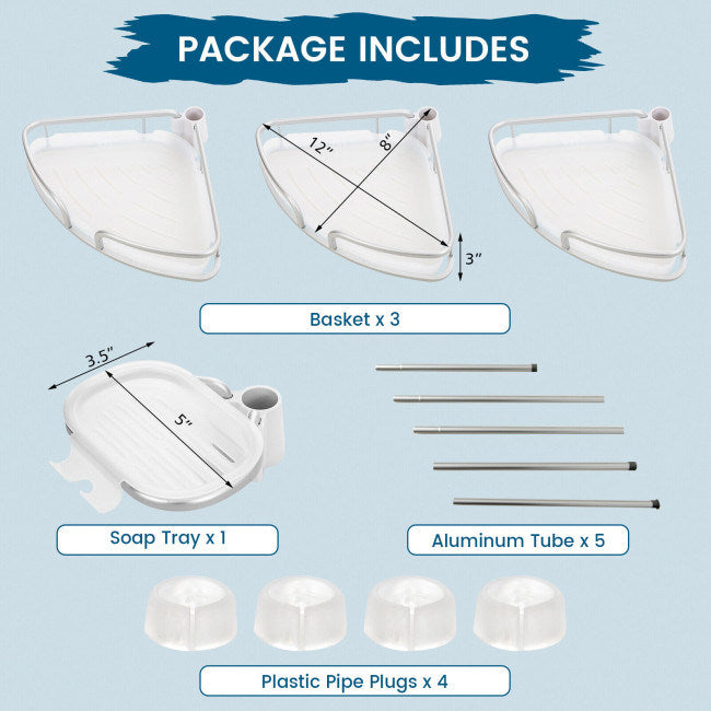 Ample Storage Space with Baskets and Tray: This corner shower caddy comes with 3 storage baskets for shampoo, conditioner, body washer, etc. The soap tray has 2 hooks for hanging towel, bath ball, etc.