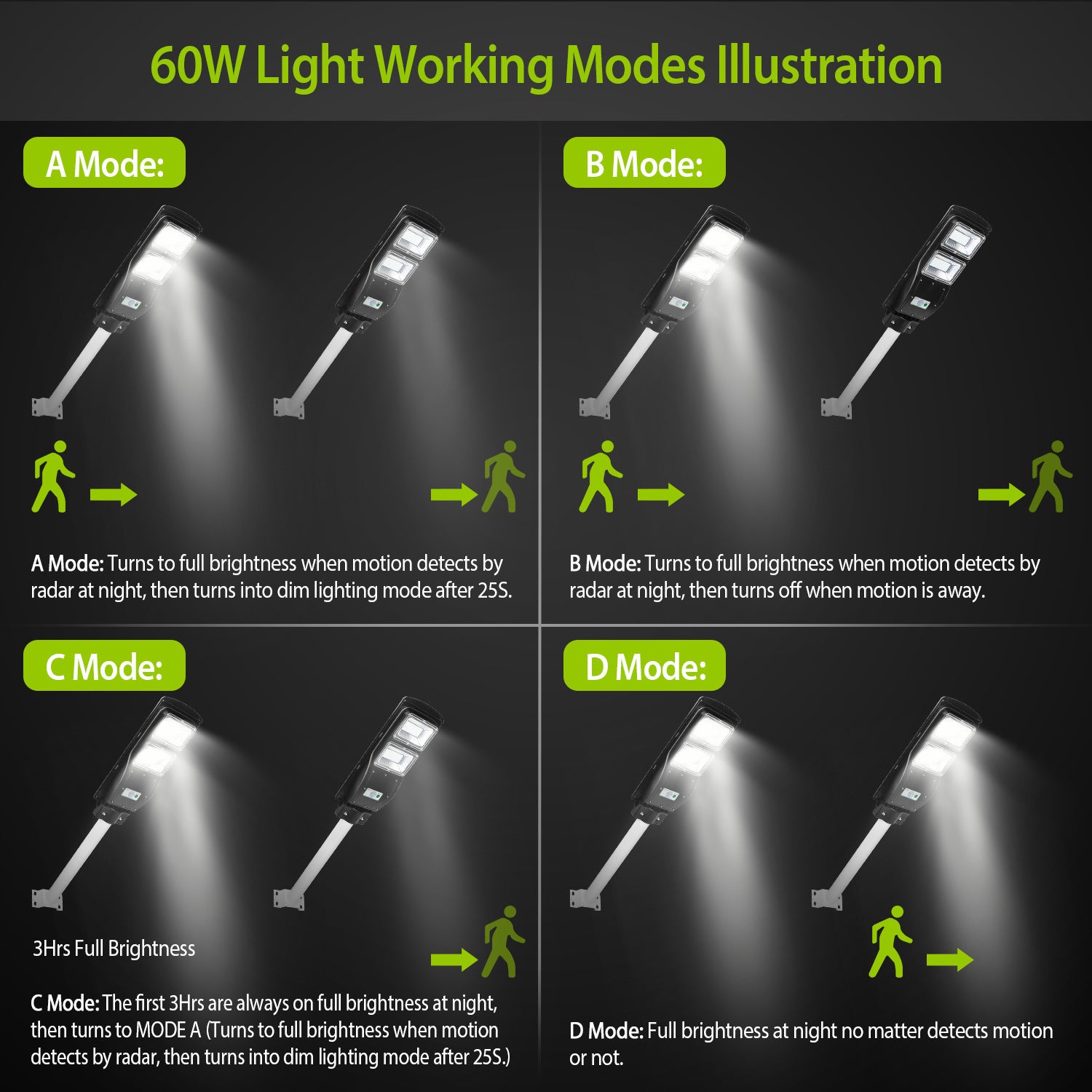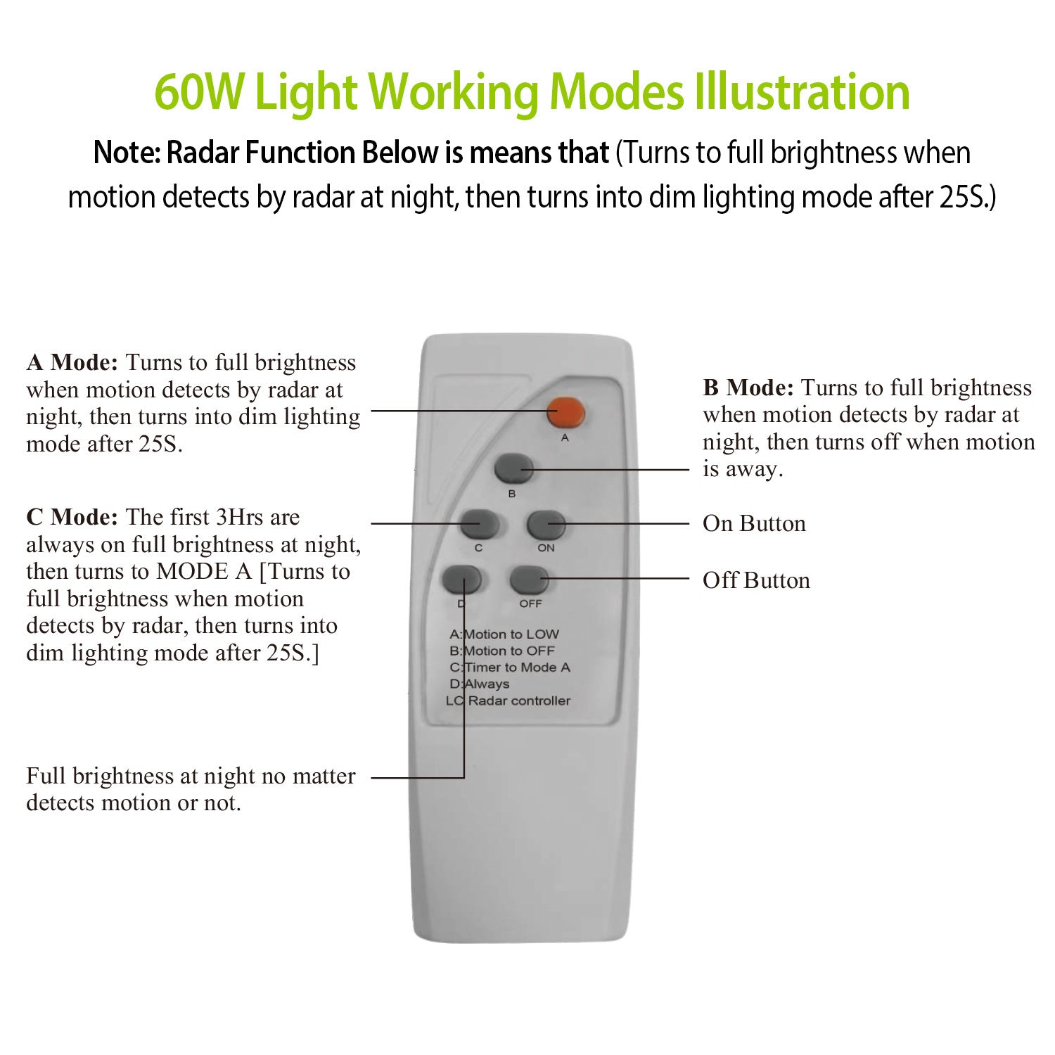 Modes: A Mode: Turns to full brightness when motion detects by radar at night; then turns into dim lighting mode after 25S. B Mode: Turns to full brightness when motion detects by radar at night; then turns off when motion is away. C Mode: The first 3Hrs are always on full brightness at night; then turns to MODE A [Turns to full brightness when motion detects by radar; then turns into dim lighting mode after 25S.]. D Mode: Full brightness at night no matter detects motion or not.