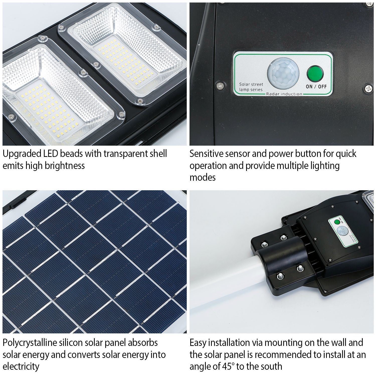 **Upgraded Solar Street Light*:Latest version outdoor solar LED light with built-in high sensitive radar detector;multiple modes with wireless remote control function within 32ft. NOTE:Please install 2pcs AAA batteries first when you use the remote controller.