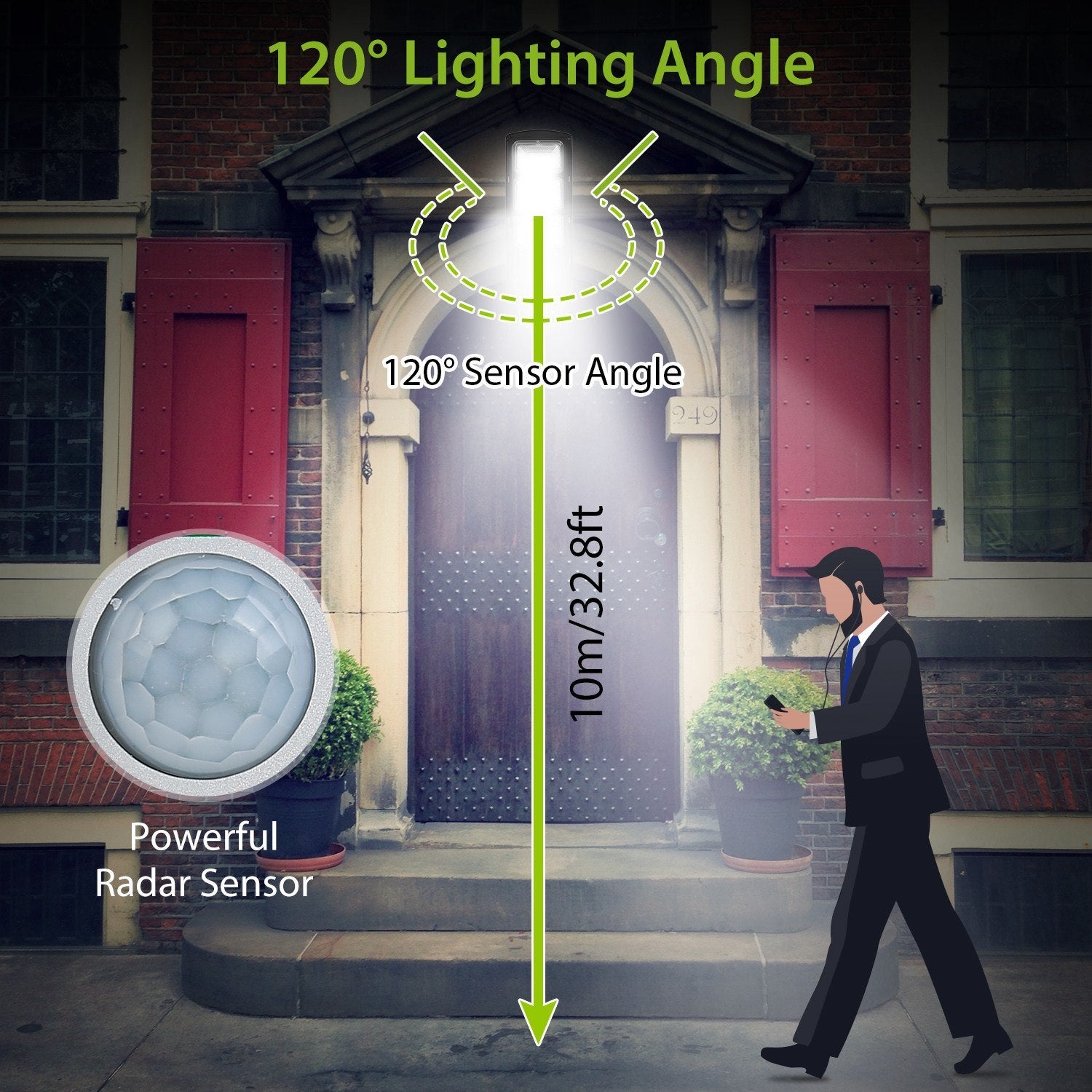 **120Pcs LEDs Ultra-Bright Solar Powered Lights*:Inbuilt bright 120Pcs LEDs; sensitive radar sensor with 120° wide sensing angle and 120° illumination angle;can provide excellent illumination and turn the dark space into a bright lighted space for security and safety protection .