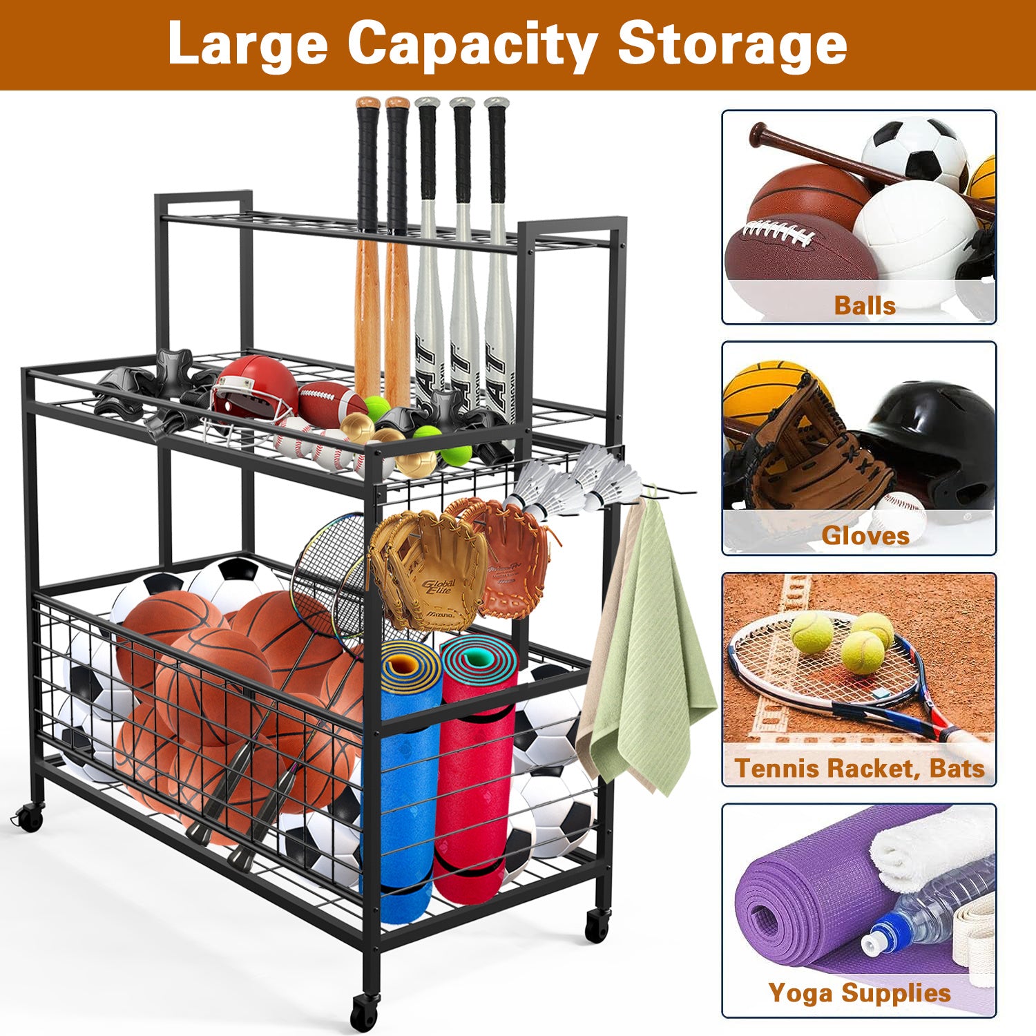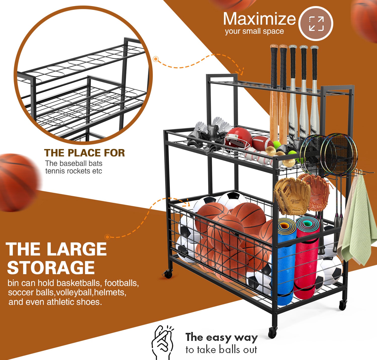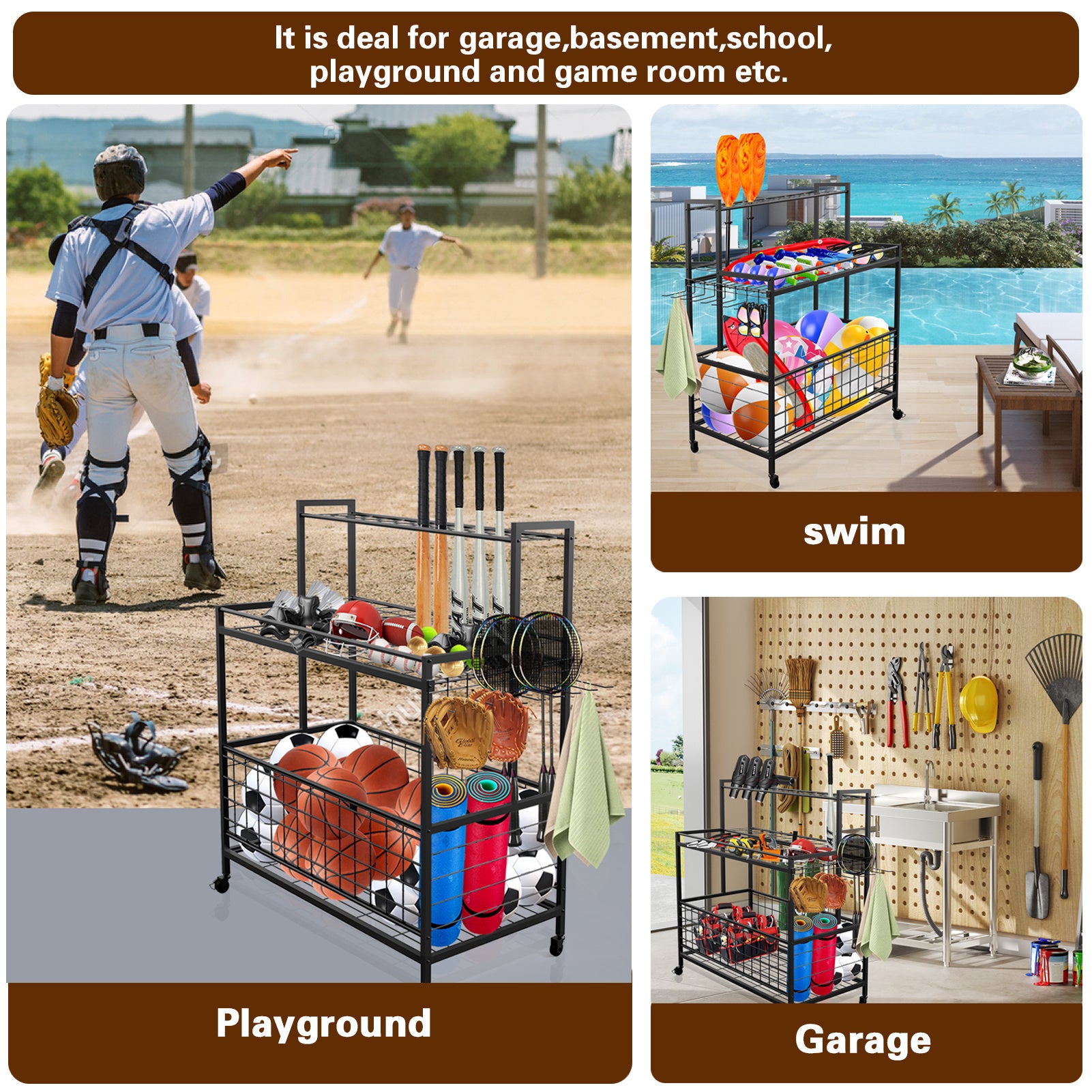 Sports equipment storage device: This sports equipment storage device consists of three main parts: it provides four garage hooks for hanging, and three storage devices of different designs for storing various sizes of sports equipment and baseball bat racks. Put all indoor and outdoor sports equipment in one basket to save space and facilitate access.