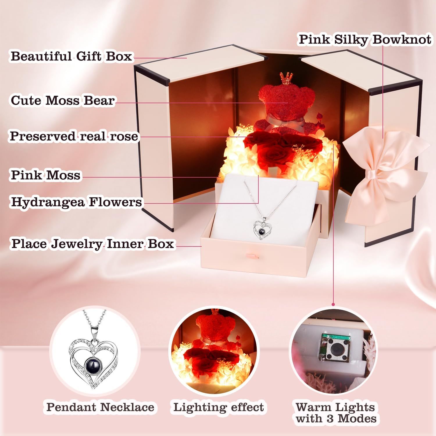Cute Decoration with Light: Presenting a lovely rose bear decoration with built-in LED lights. The rose box can be displayed indoors, adding charm to any setting.