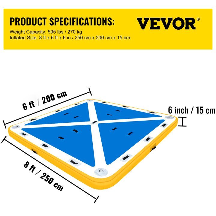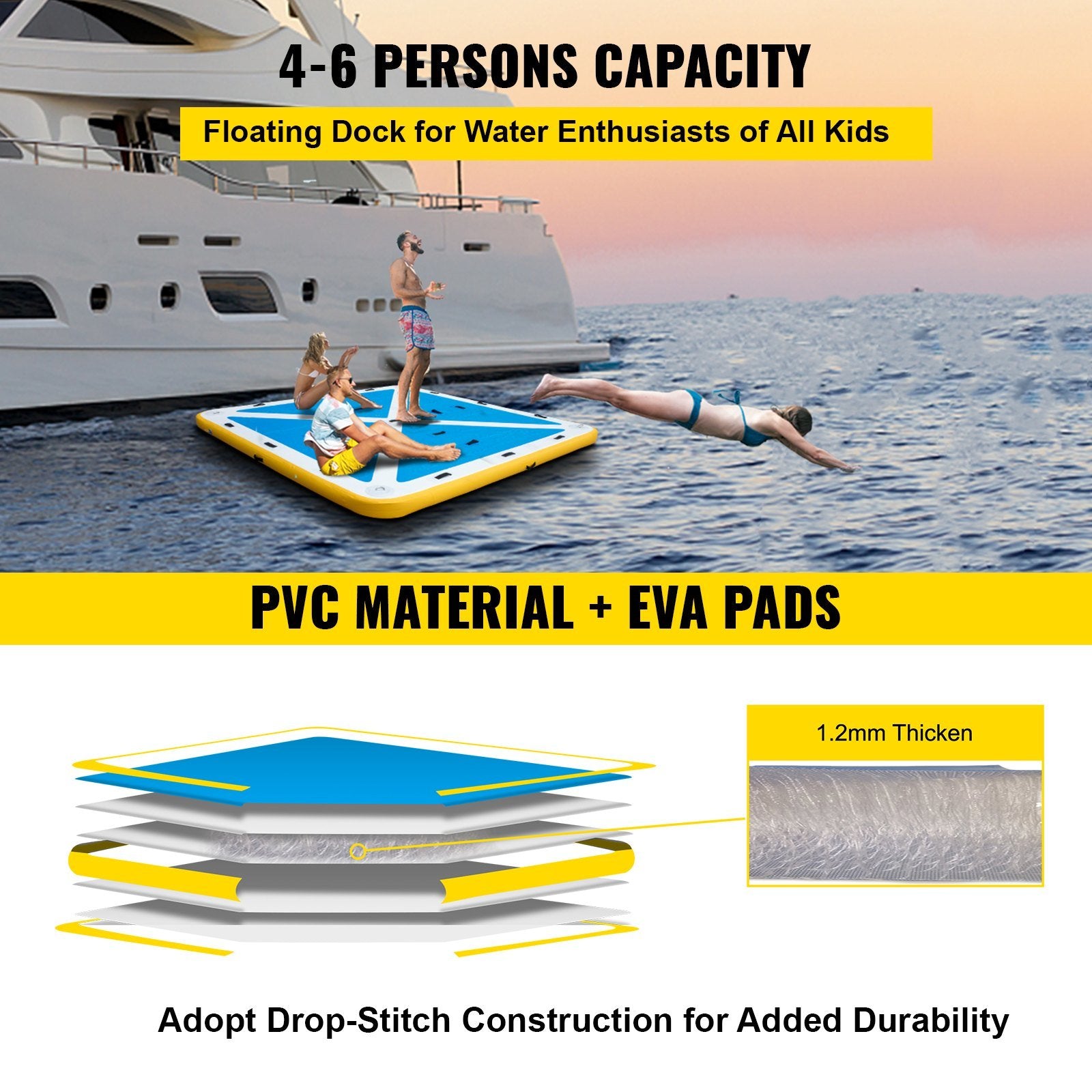 [LARGE INFLATABLE PLATFORM]- The inflatable dock is 8x6 ft, 6 inches thick. It can hold 4-6 people weighed about 595lbs. Serve as a floating resort. You can add coolers, chairs, and umbrellas to it for swimming, snorkeling, yoga, lake lounging, or tanning.